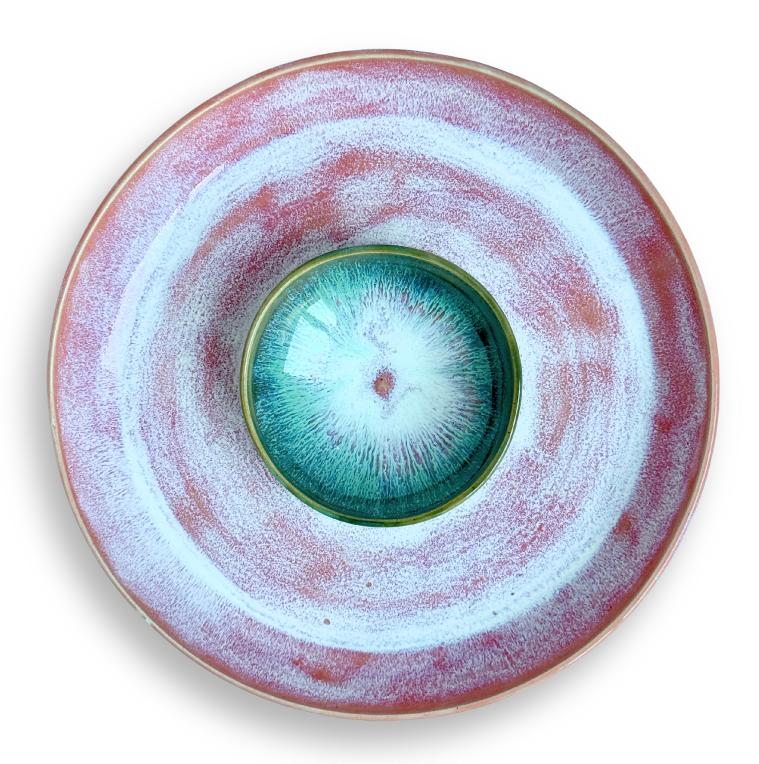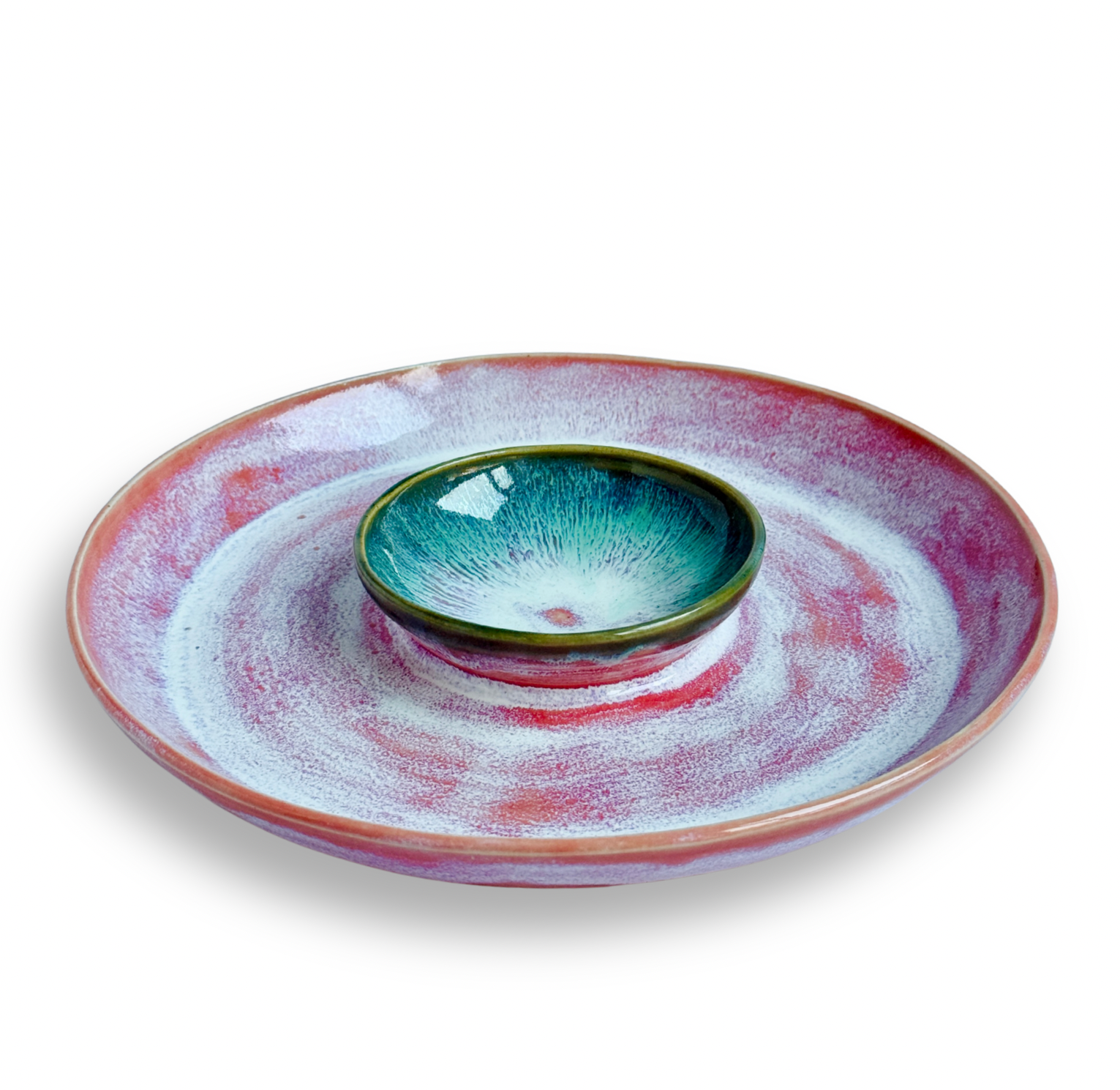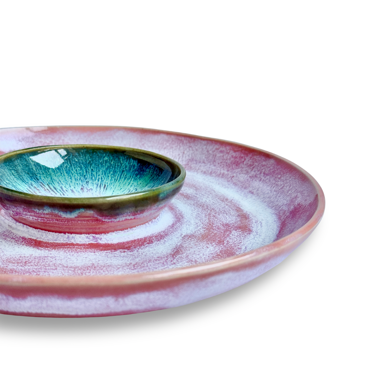 Wheel thrown stoneware gyoza (chip & dip) plate glazed in a pink glaze with flux wash. Central sauce bowl has a green copper wash.